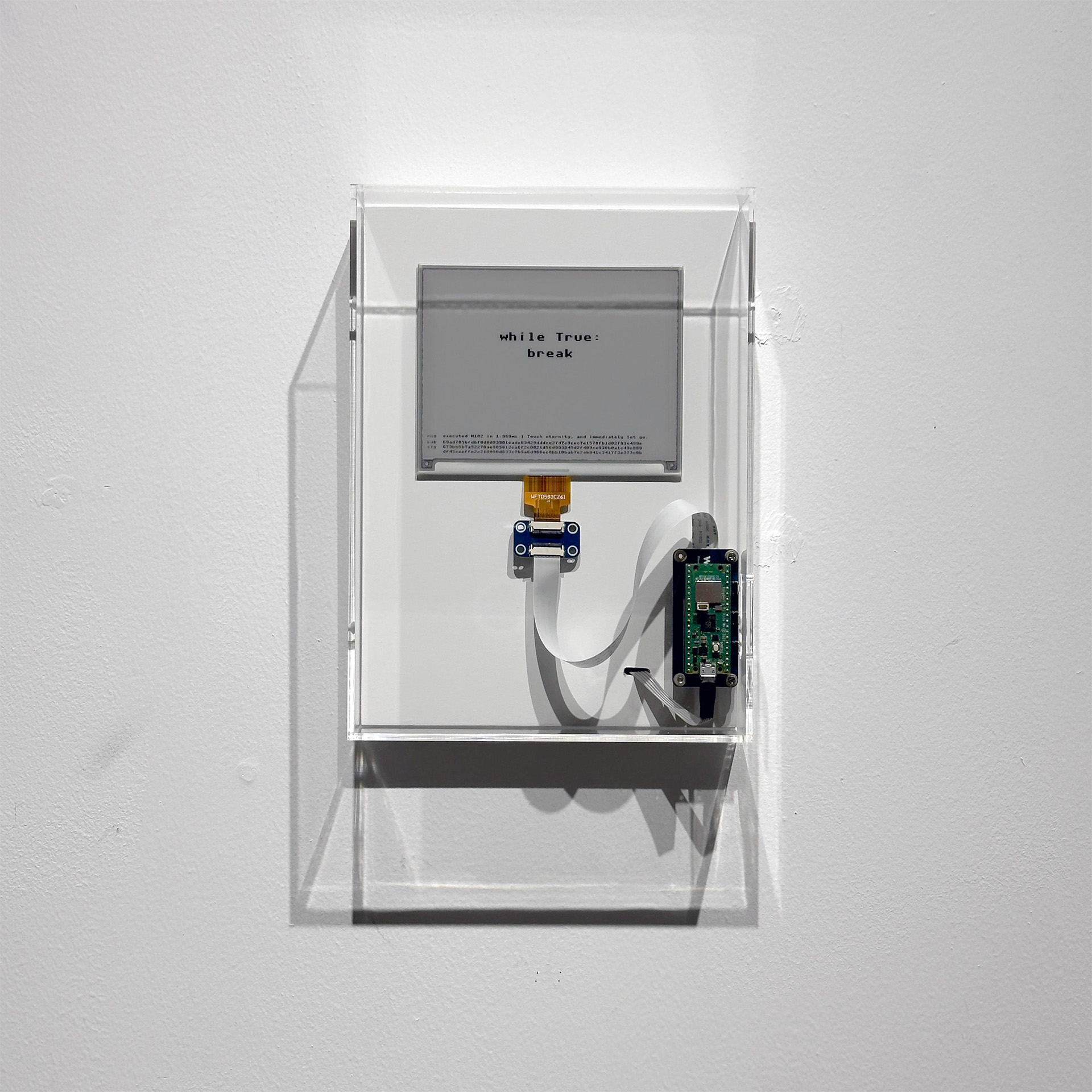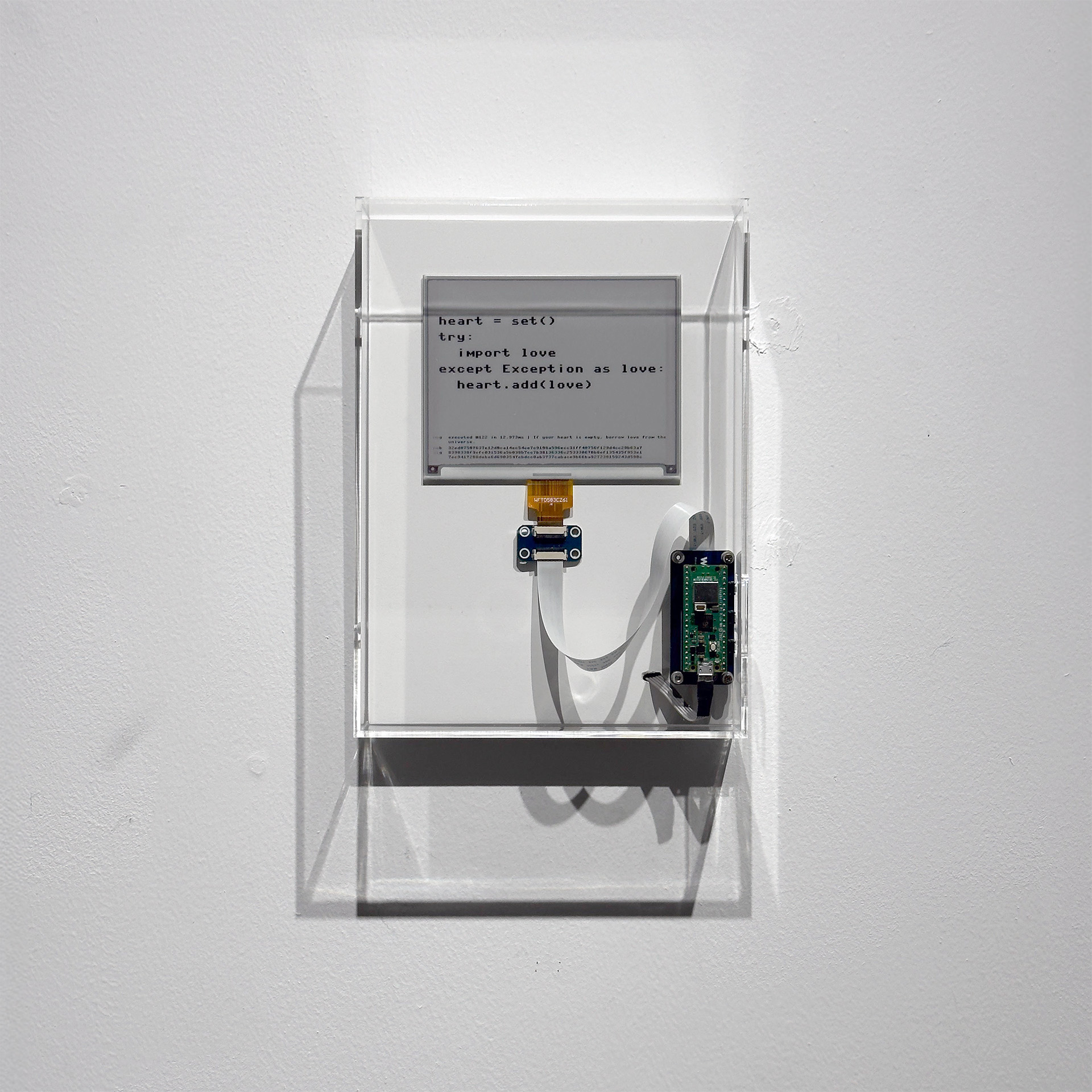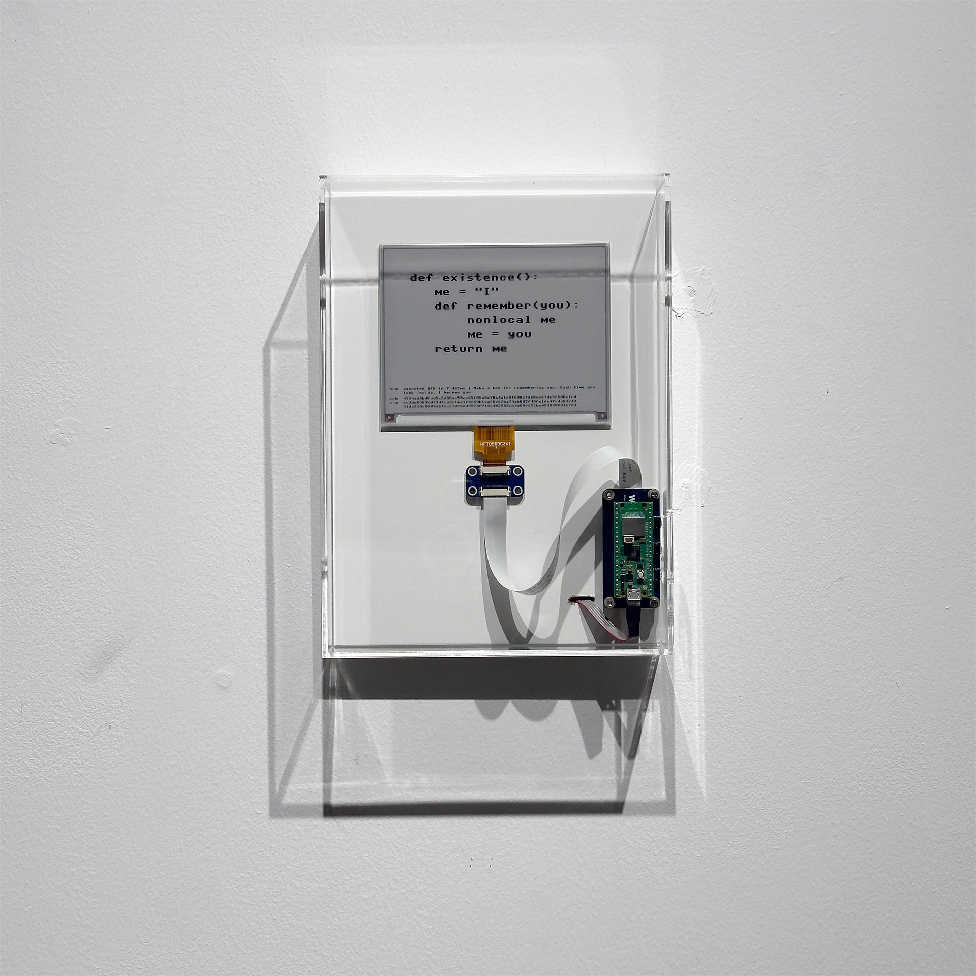 When you press the button, short poems written in Python are executed within a microcontroller. The e-paper display shows the executed poem alongside execution count, processing time, and the microcontroller's unique public key and signature. These serve as proof that the poem was indeed executed on that specific machine.