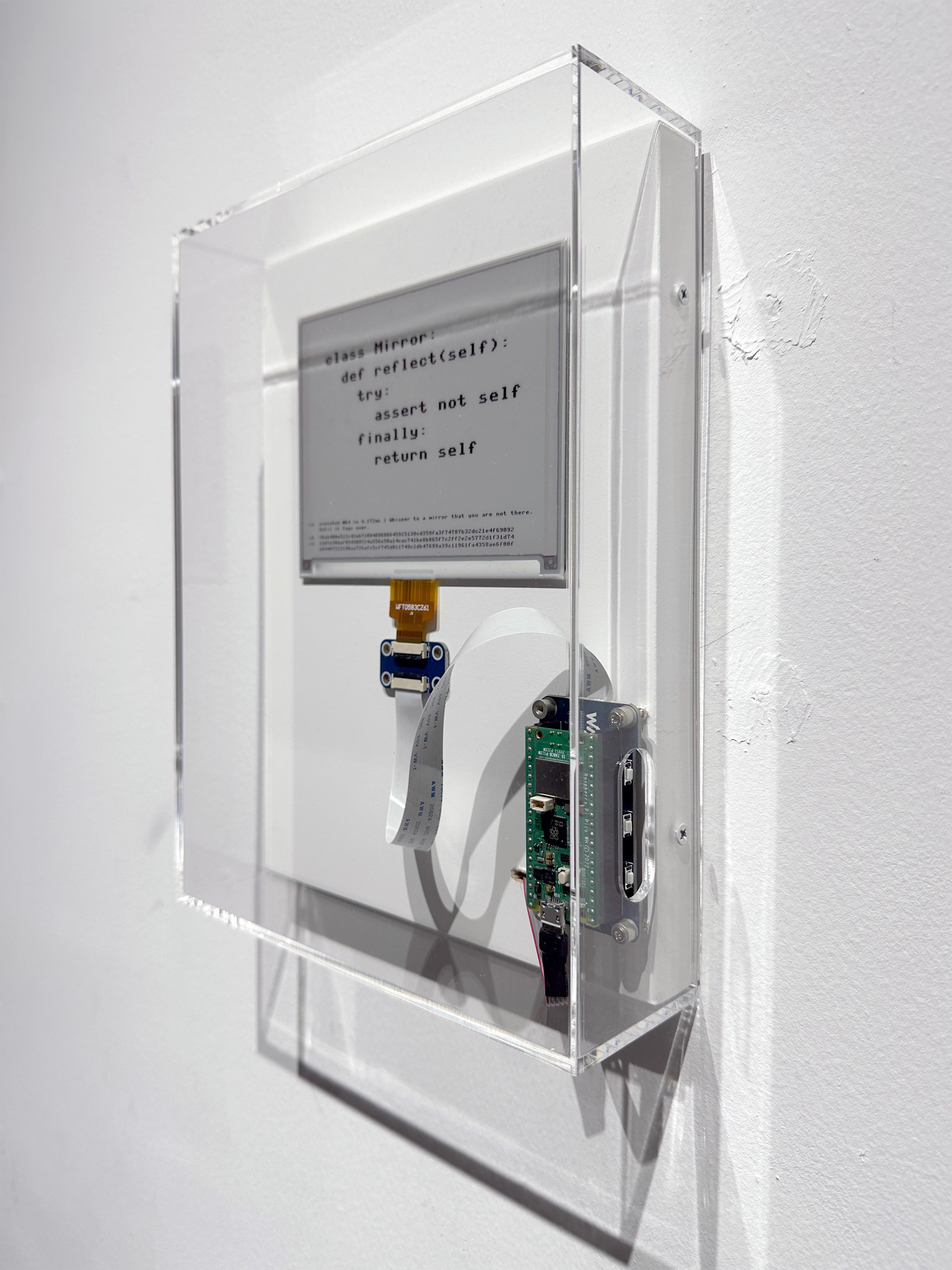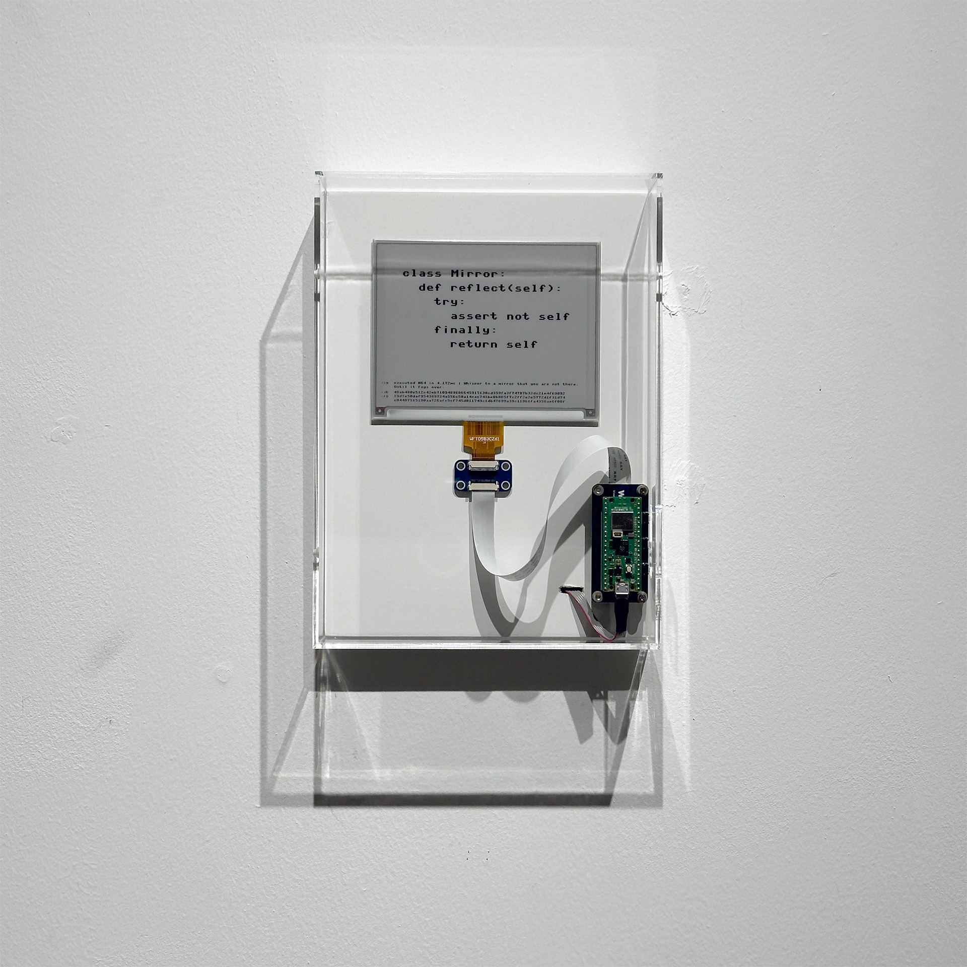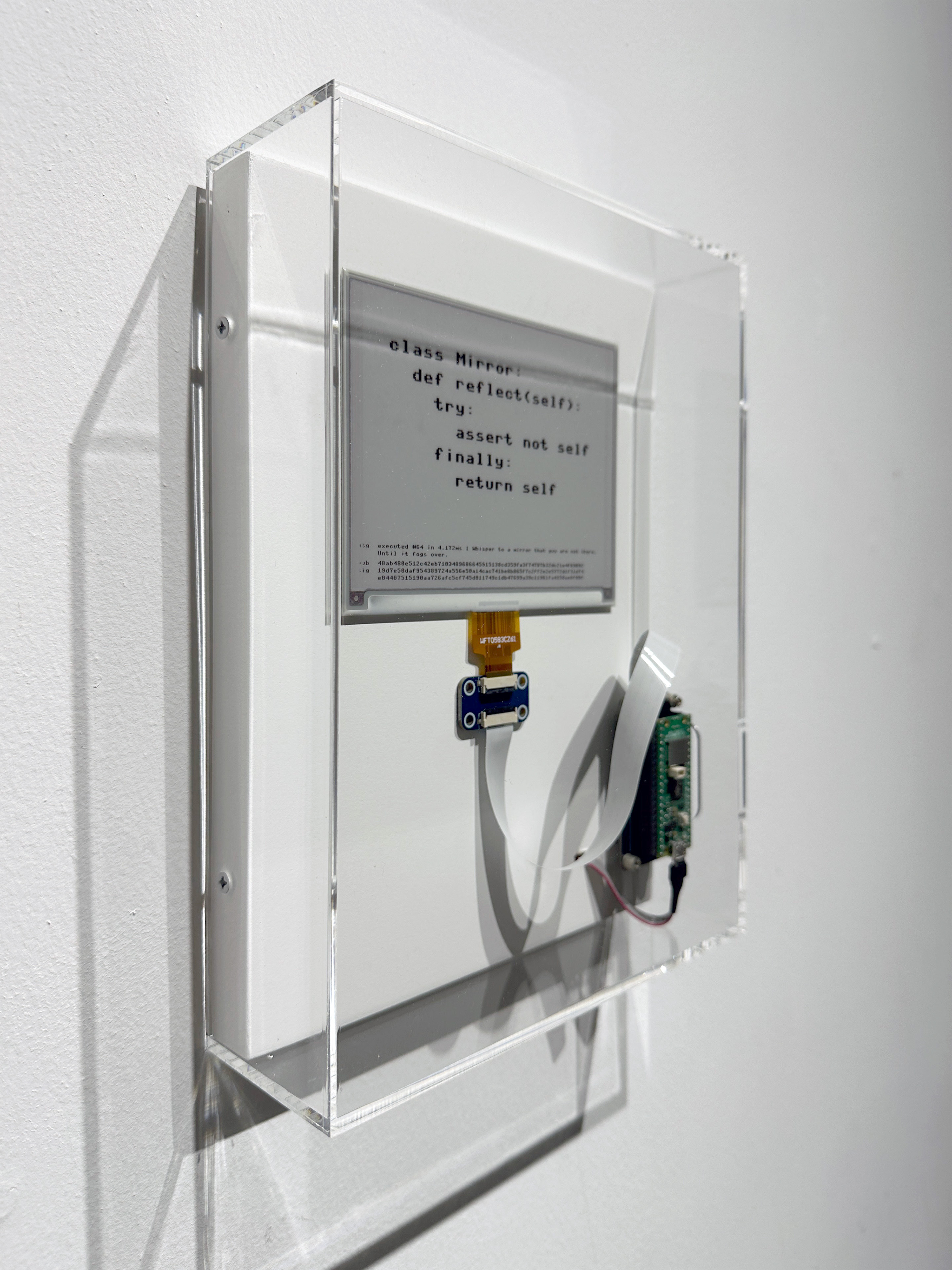 When you press the button, short poems written in Python are executed within a microcontroller. The e-paper display shows the executed poem alongside execution count, processing time, and the microcontroller's unique public key and signature. These serve as proof that the poem was indeed executed on that specific machine.